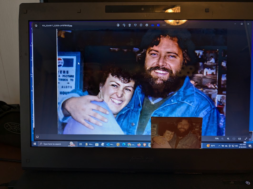 Aside: That small "insert" in that pick was a photo I found going through her stuff. I scanned and sent that pic to our granddaughter who does a lot of photo recovery and repair. The larger pic is my screen when she sent me the first draft of her repair work. I snapped the pic of the screen with the original pic in from to send back to her to see the difference.